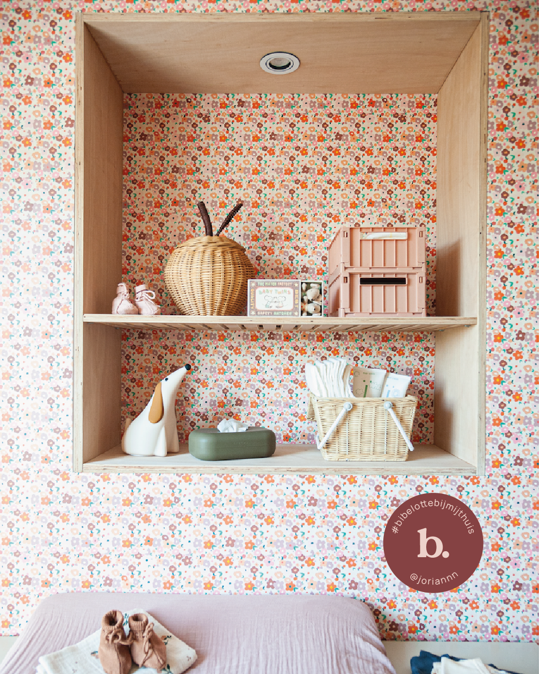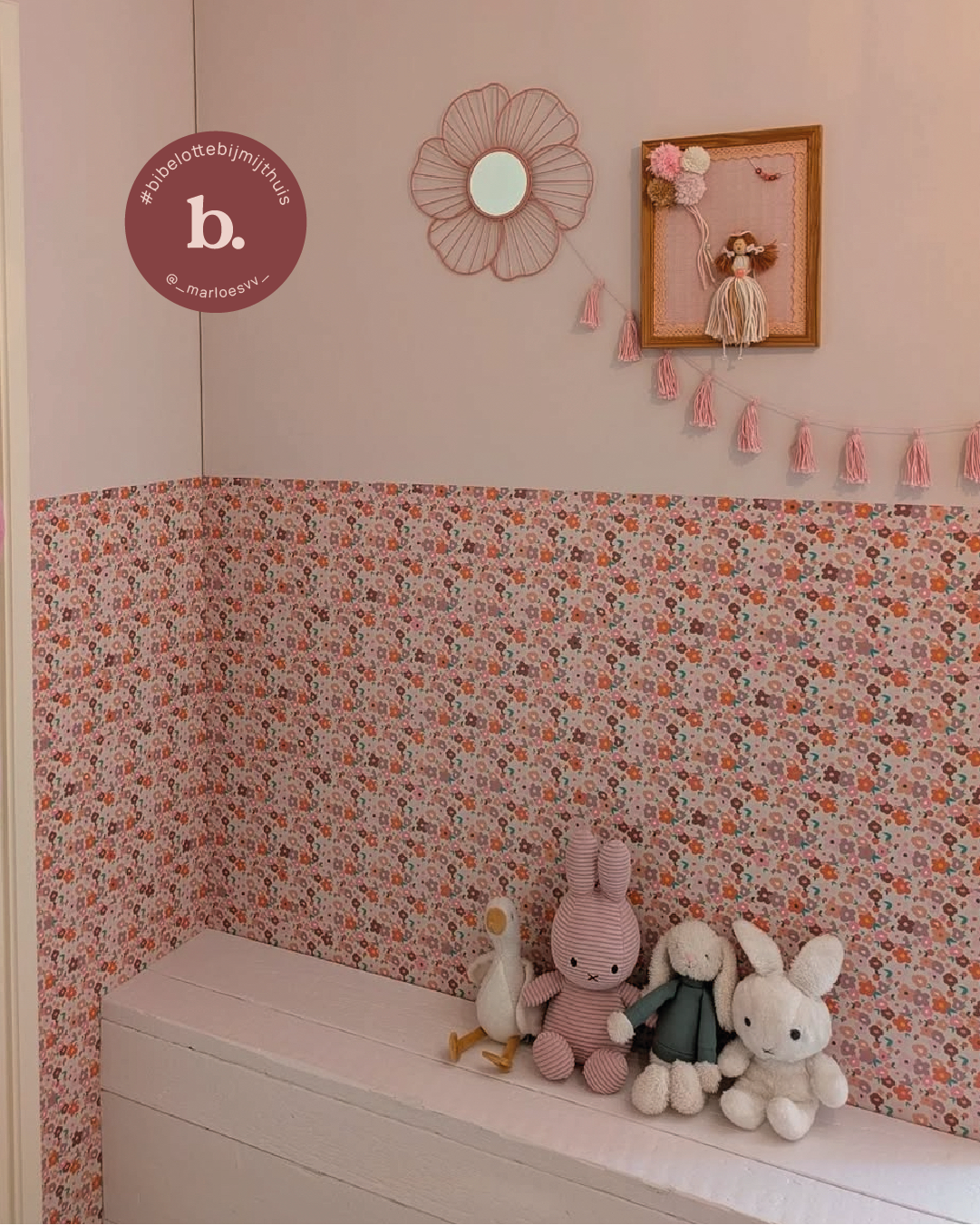 Behang Joy heeft een frisse bloemenprint in roze, oranje en groen op een crèmekleurige ondergrond. Ideaal voor een vrolijke en lichte uitstraling in elke kamer.