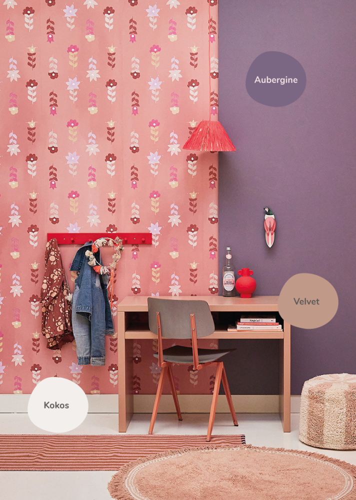 Het mixen en matchen van Bibelotte behang en verf kleuren doe je op tal van leuke, creatieve manieren!