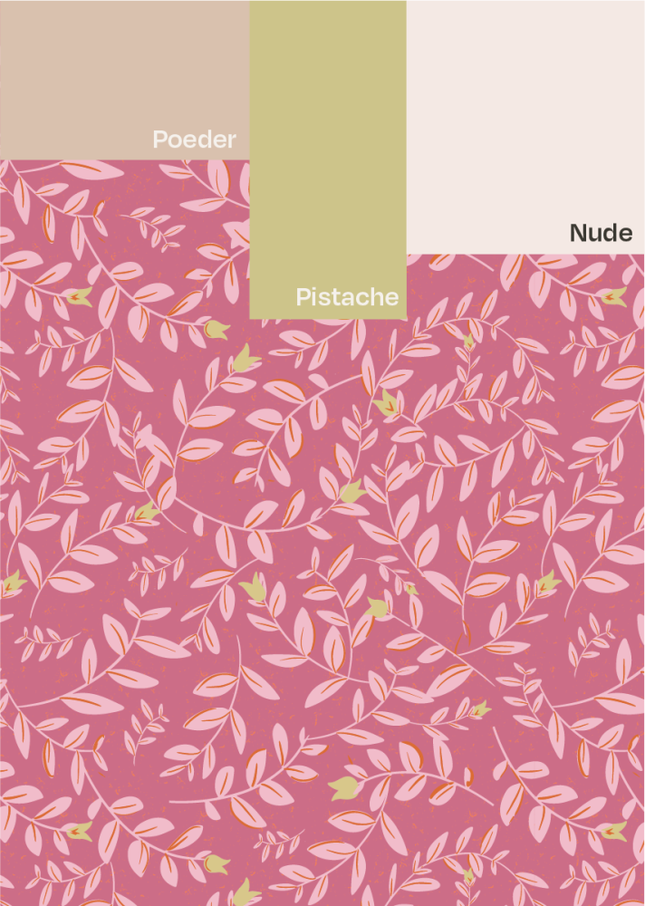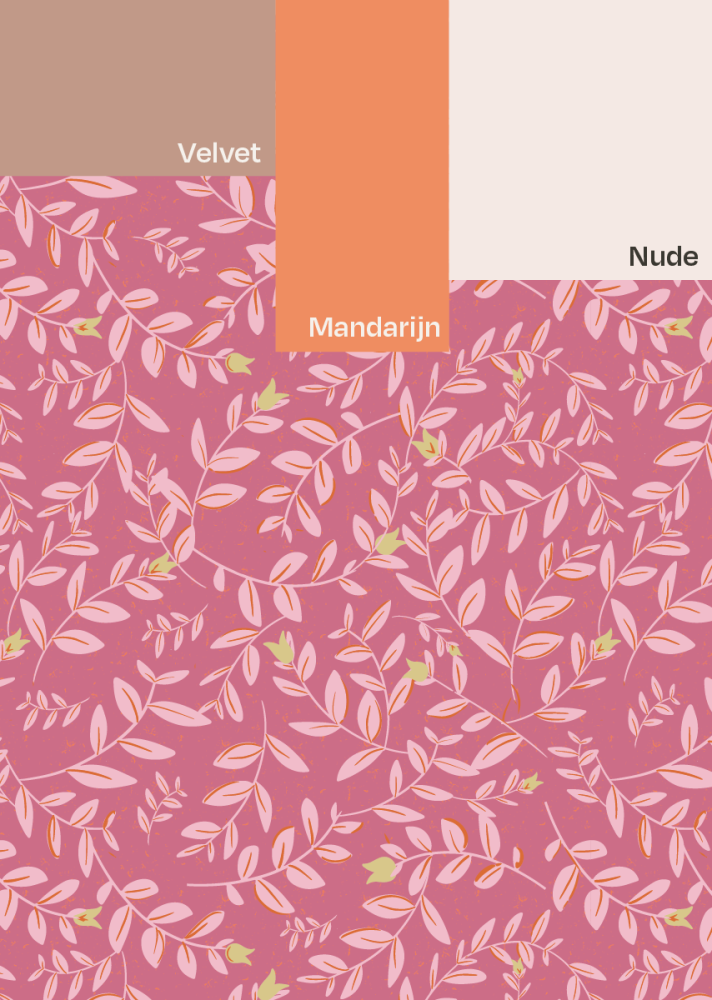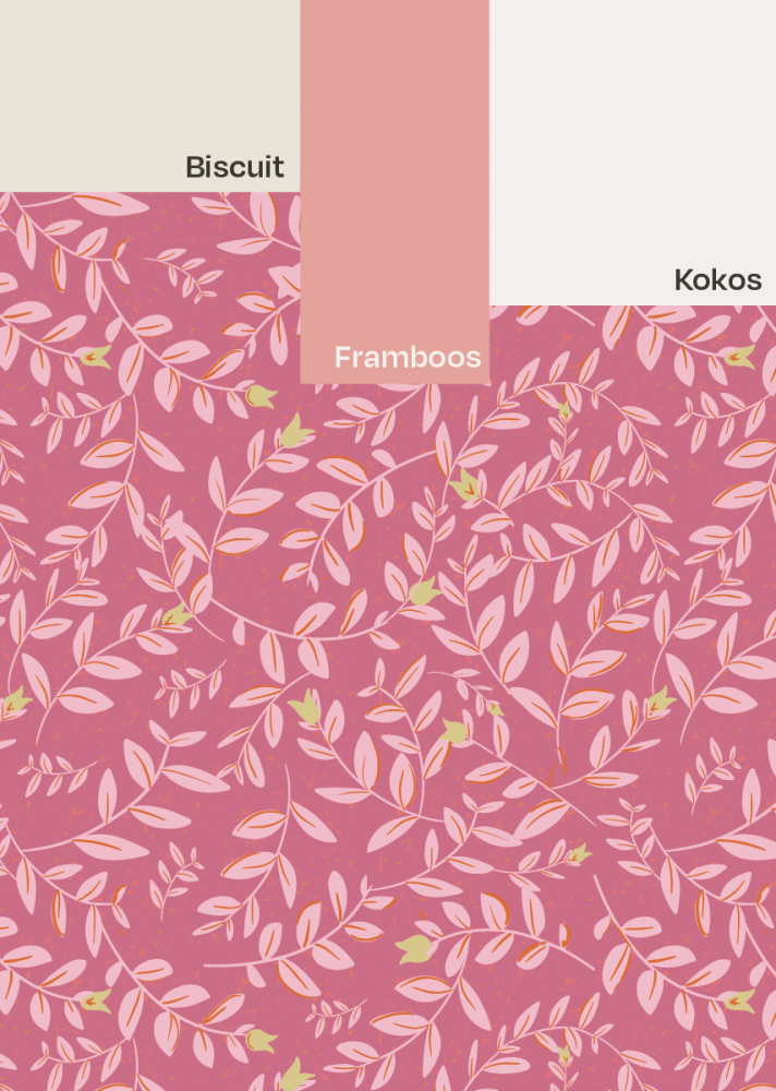 Veilig en neutraal, een combinatie die altijd goed zit. Flora fuchsia is al een echte eyecatcher, dus een rustige basis laat het behang nog beter tot zijn recht komen. Gebruik Kokos als basiskleur – zacht, tijdloos en overal bij passend. Combineer met de kleur Biscuit op één muur en de kozijnen. Deze beige tint met een groene ondertoon brengt balans in de ruimte. Voor een subtiel accent gebruik je Framboos. Deze zoetroze kleur verbindt alles met elkaar en laat het behang nog zachter ogen. Voeg wat roze accessoires toe – een lampje, dekentje of wandplankje – en de kinderkamer is helemaal compleet.