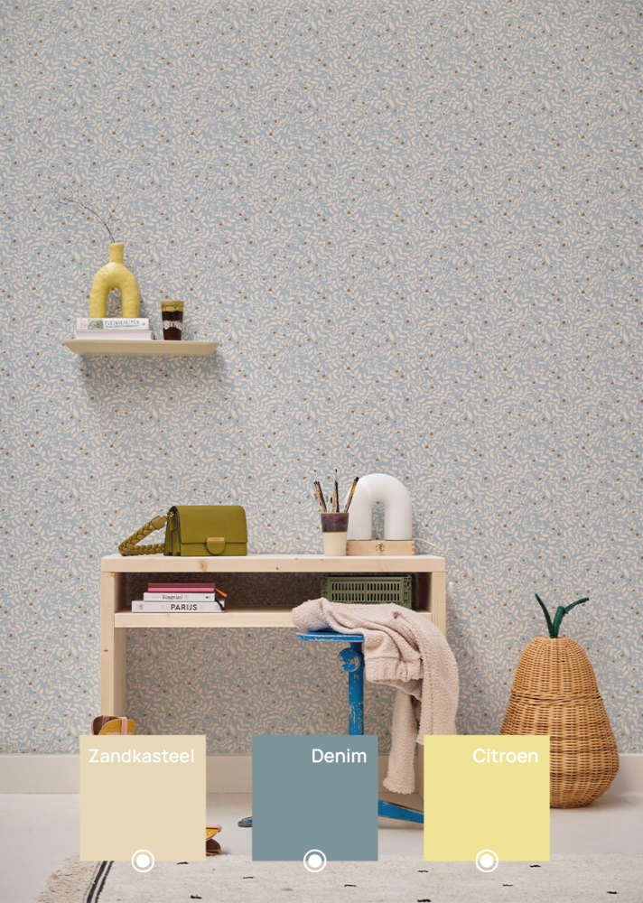 Maak het af met Boterbloem voor een nachtkastje, een stoel of een plankje – de gele tint laat de bloemetjes in het behang stralen. Werk het geheel af met gele accessoires of een dekbedovertrek met een subtiel printje, zodat alles mooi in balans blijft.