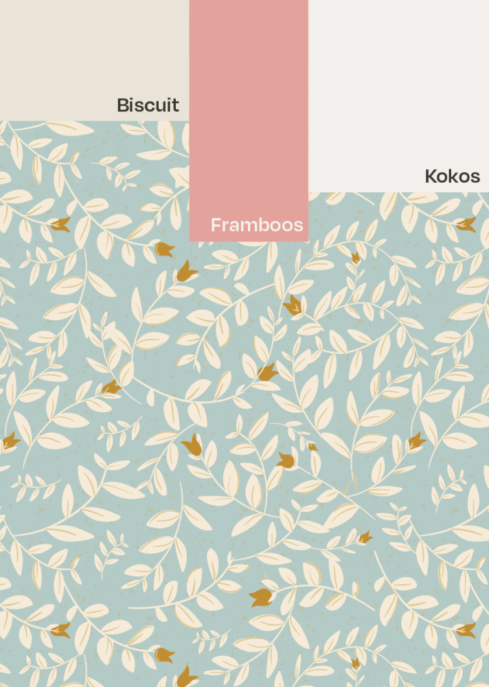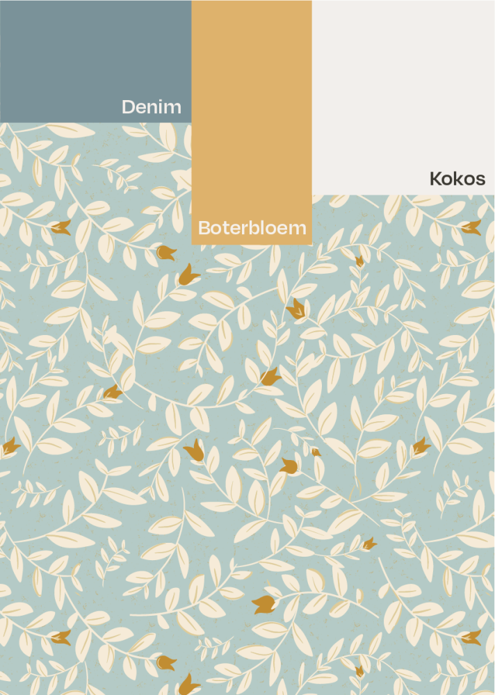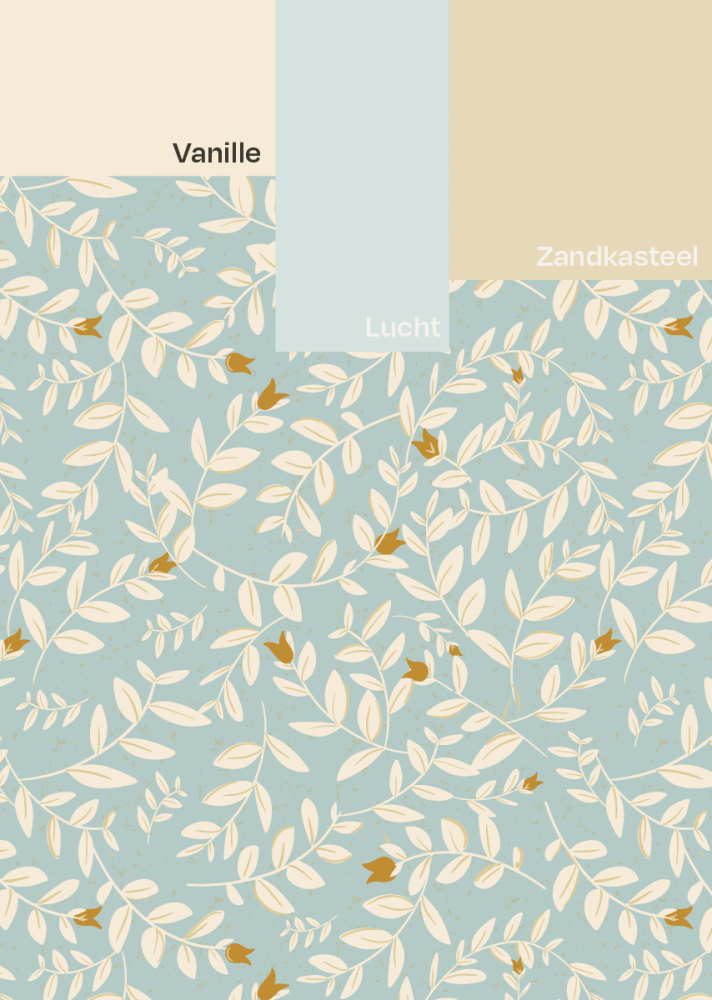 Veilig en neutraal, een combinatie die altijd goed zit. Met Zandkasteel als basiskleur ontstaat er een zachte, natuurlijke basis. Voeg wat licht toe met Vanille – deze zachtgele tint maakt het geheel net wat frisser en accentueert de lichte blaadjes in het behang. Extra leuk: kies voor kinderbed Soof in Vanille om de tint terug te laten komen.