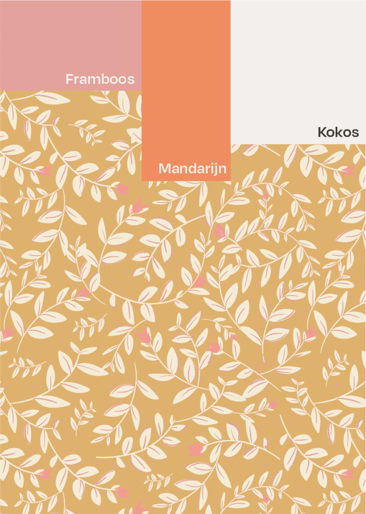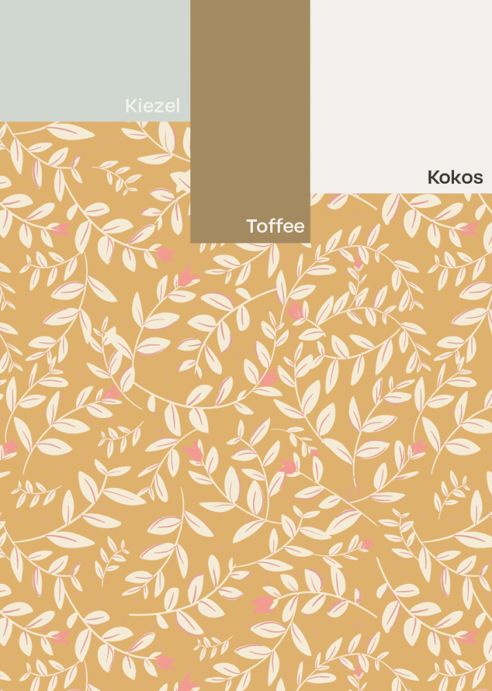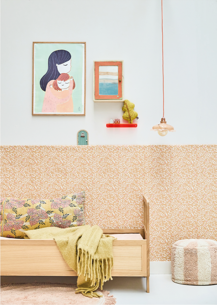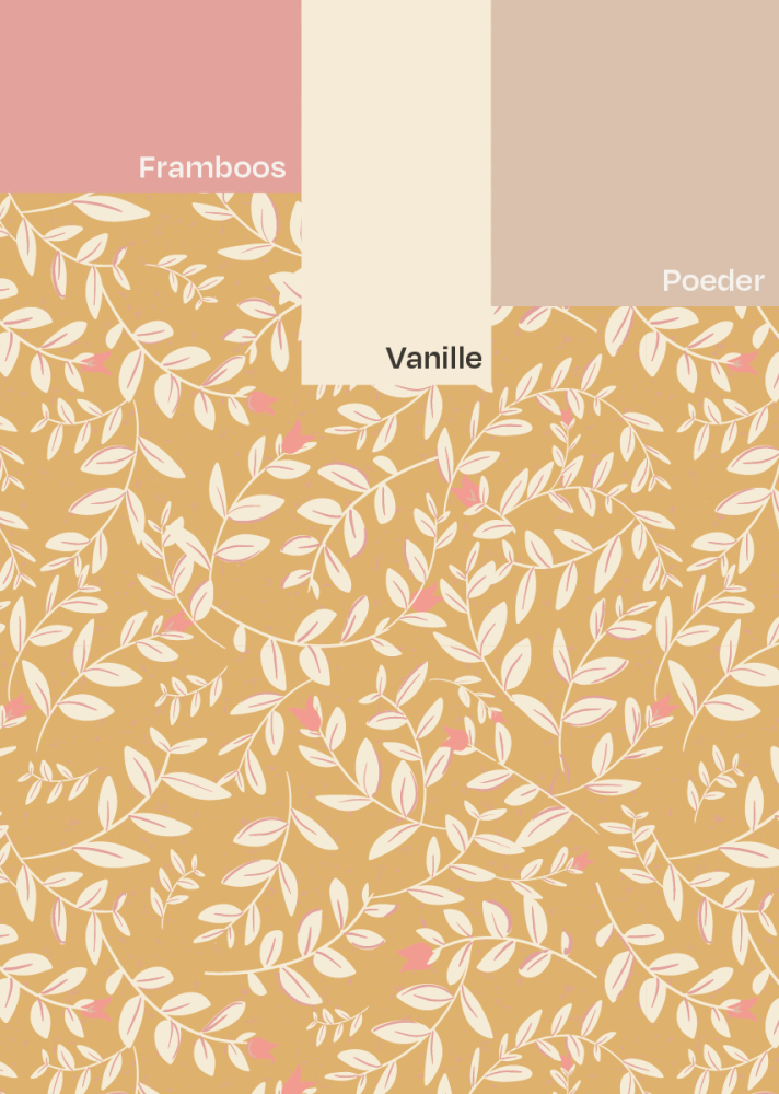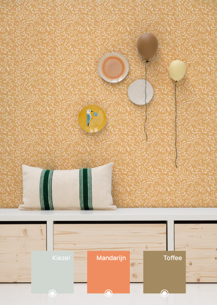 Voor een klein accent is Vanille een perfecte keuze. Deze zachtgele tint haalt de warme blaadjes uit het behang omhoog. Mooi op een wandplankje, het randje van een bed of een houten krukje – kleine details die alles samenbrengen.