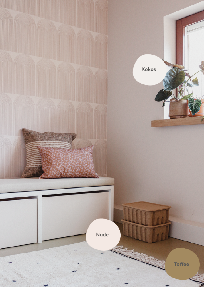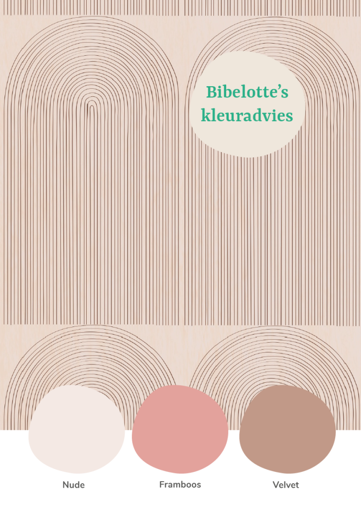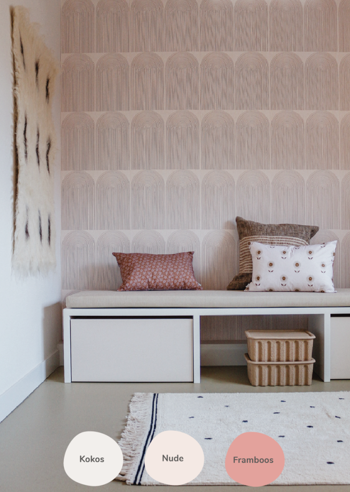 Ga voor een veilige en neutrale look die altijd goed werkt. Gebruik de kleur Nude als zachte basis; deze roze tint sluit prachtig aan bij het behang. Combineer dit met Velvet voor een warme touch en voeg Framboos toe in accessoires voor nét dat beetje extra flair. Zo creëer je een harmonieuze en stijlvolle sfeer.
