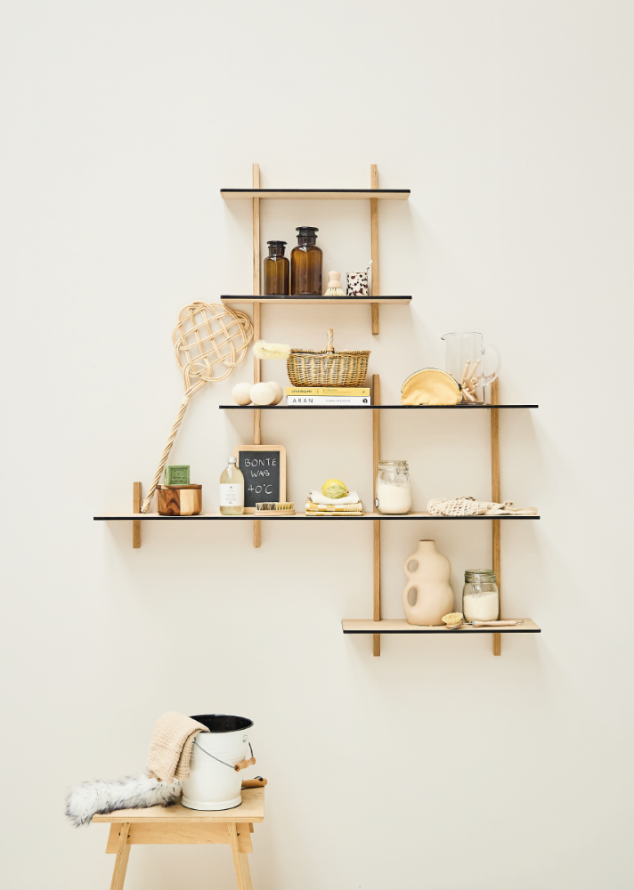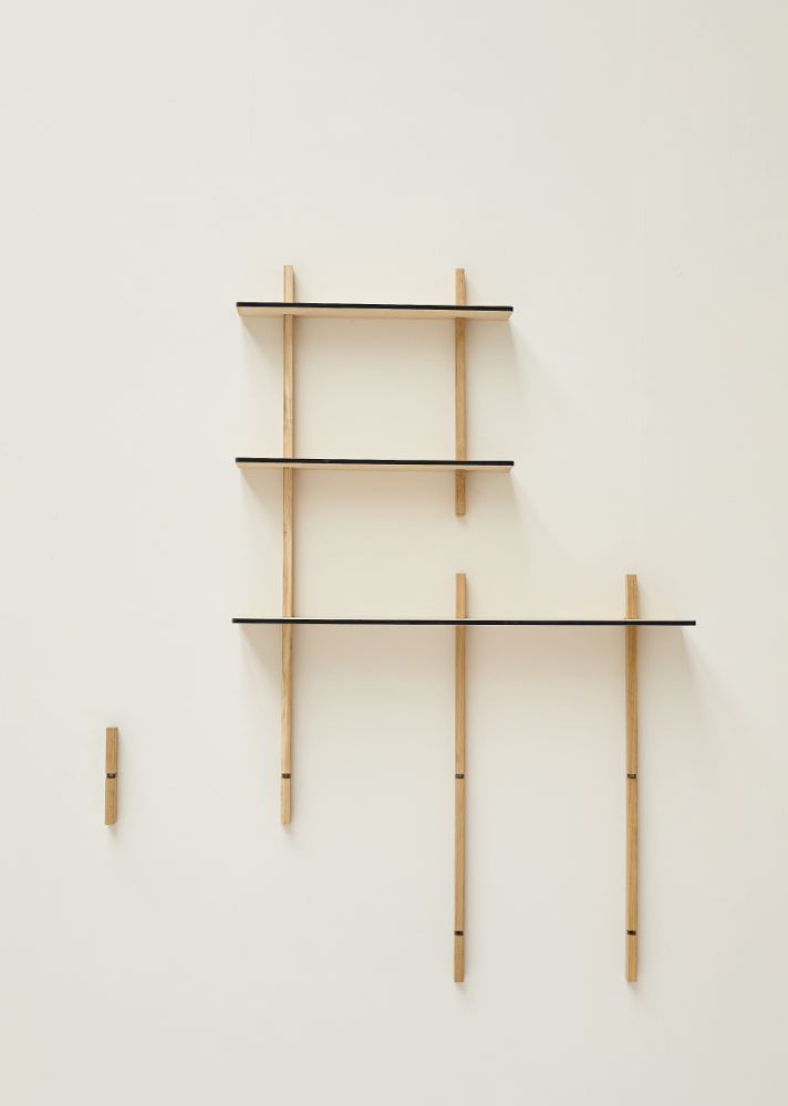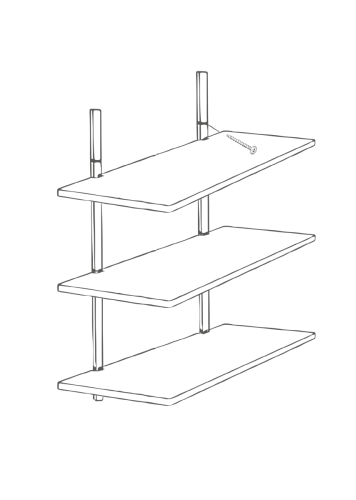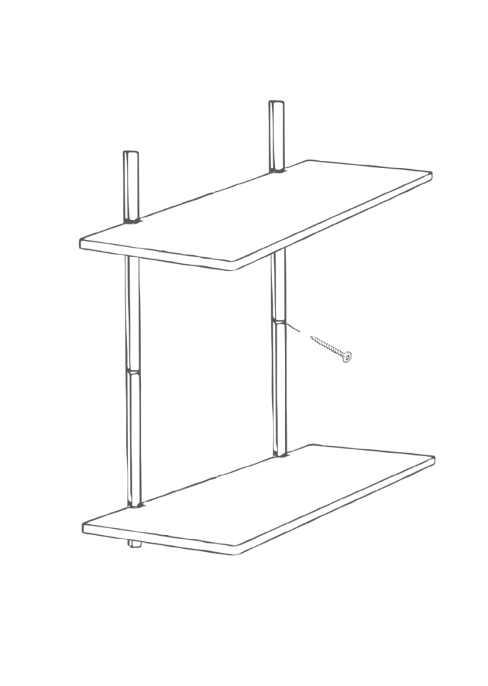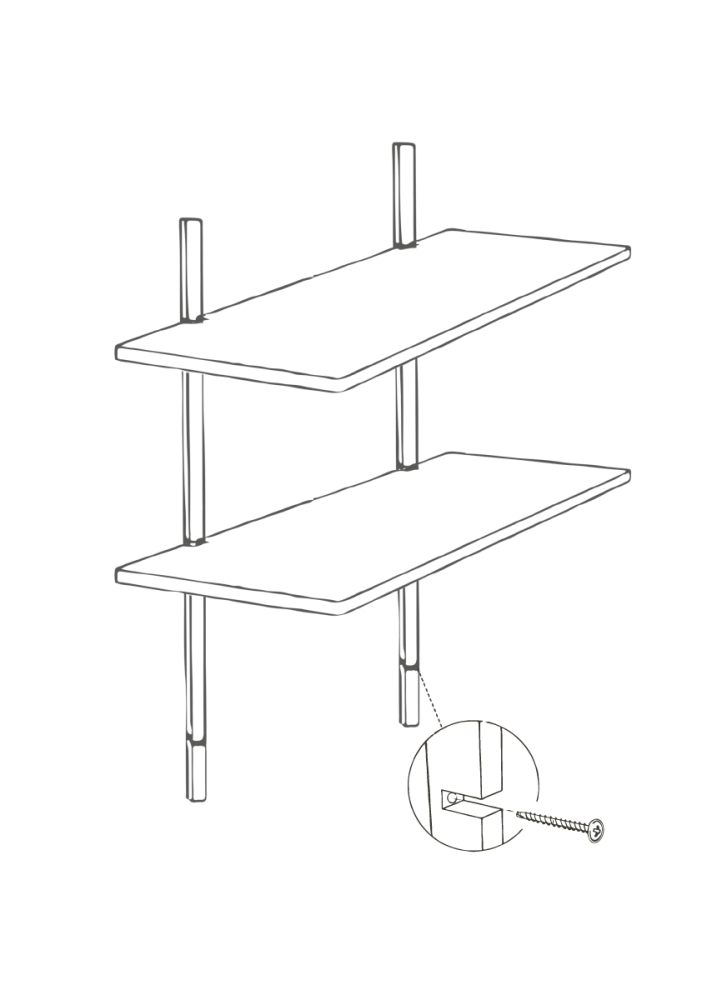 Schuif de eerste plank in de staanders. Bevestig daarna de andere staanders en schuif de rest van de planken op hun plek. Je werkt als het ware van links naar rechts (of andersom), steeds met plank + staander tegelijk.