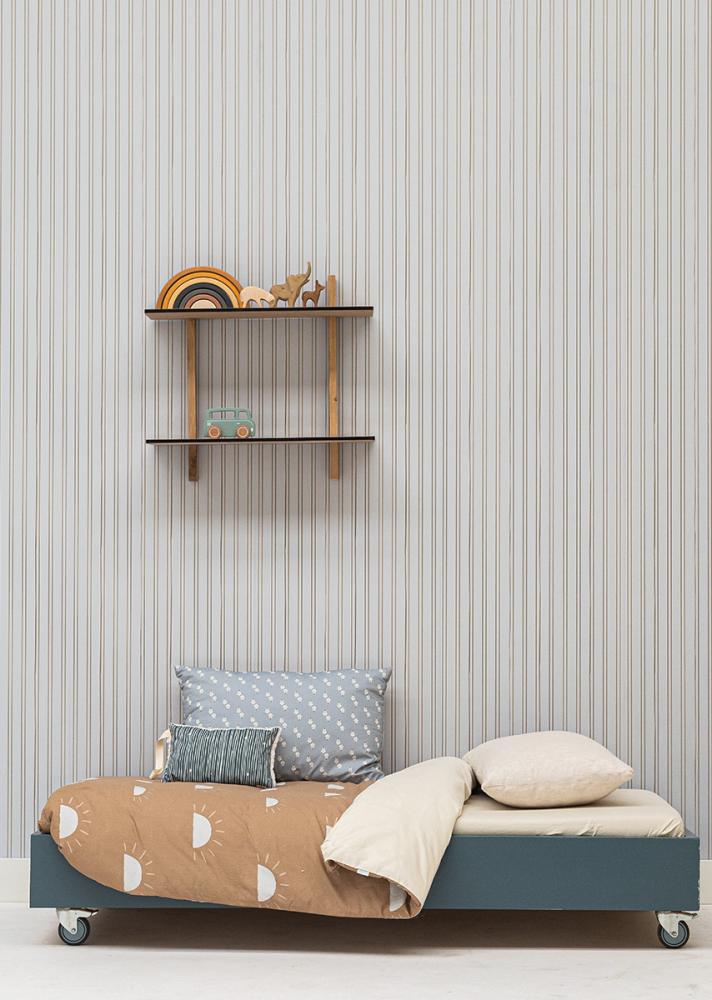 Op nummer 1 staat Gestreept biscuit. Hét favoriete streep behang voor de baby- of kinderkamer. Het zachte patroon met behang strepen is neutraal en daardoor perfect voor zowel jongens als meisjes. Ideaal als je nog niet weet wat het wordt, maar wél alvast een warme basis wilt neerzetten. Wil je meer sfeer en diepte? Combineer dit streepbehang eenvoudig met onze verfcollectie – de tinten zijn speciaal op elkaar afgestemd zodat jouw interieur in balans blijft.